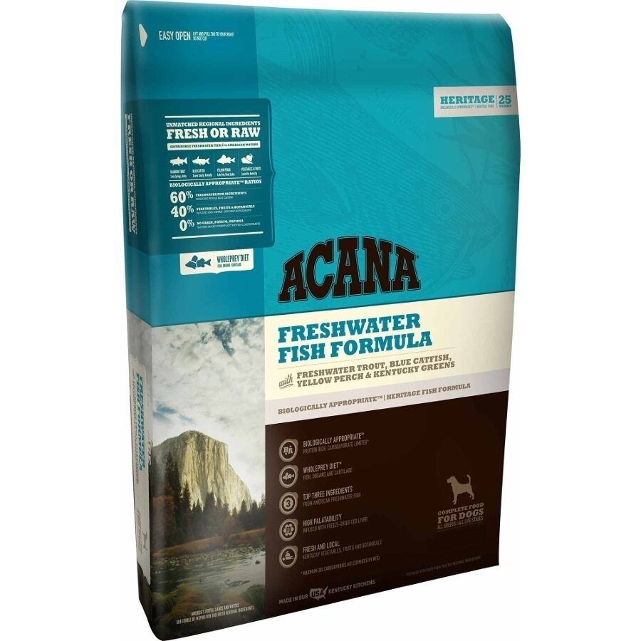 Feed your furry friend a meal thats nutritious delicious and full of protein with ACANA Freshwater Fish Recipe Grain-Free Dry Dog Food. ACANA Freshwater Fish recipe is balanced with 60 quality animal ingredients like rainbow trout catfish and perch and 40 fruits vegetables and botanicals. ACANA Dog Food - Heritage Freshwater Fish - 13 lbs.
